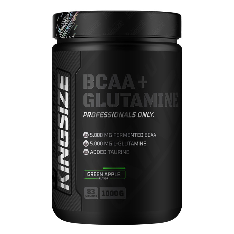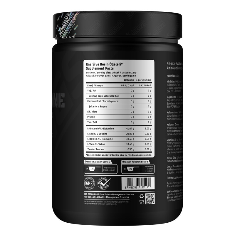 It is a special formula developed for the needs of athletes who train intensely, offering BCAA and Glutamine amino acids in a single product and in equal proportions. With its fermented herbal BCAA raw material, it does not carry the risk of allergens. Kingsize Nutrition BCAA + Glutamine Powder supports the training efficiency of athletes thanks to its easy-to-digest formula enriched with taurine. It is offered with options consisting of green apple and watermelon flavors for a pleasant and delicious consumption.The raw material origin of Kingsize Nutrition is Germany. Certificate of origin for the supplied raw materials is available in the product images. The product is manufactured in Turkey under the assurance of Supplements.com, within the scope of BRC Grade A, GMP, HACCP, ISO 22000:2005 food safety management systems and at VHMS production facilities that have ISO 9001:2015 quality and assurance certificates.