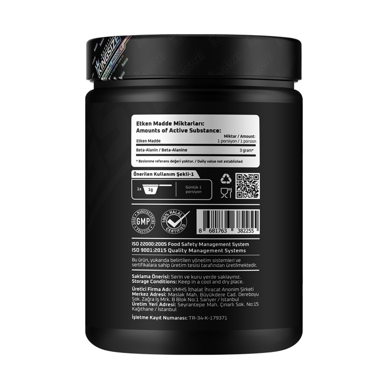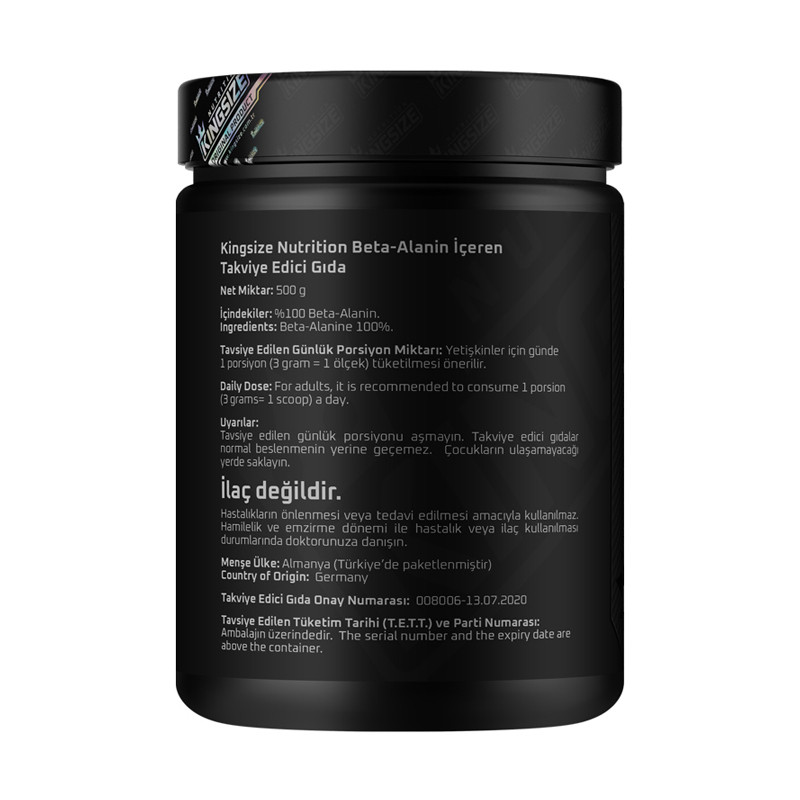 Kingsize Nutrition Beta Alanine Powder 500 Gr offers 3000 mg of Beta alanine per serving, especially for advanced and intermediate level athletes during intense training periods. There is no additional additive in the product containing 100% Beta alanine. Thanks to its unflavored nature, it can be mixed with water or any beverage of your choice, providing ease of consumption.The raw material origin of Kingsize Nutrition is Germany. Certificate of origin for the supplied raw materials is available in the product images. The product is manufactured in Turkey under the assurance of Supplements.com, within the scope of BRC Grade A, GMP, HACCP, ISO 22000:2005 food safety management systems and at VHMS production facilities that have ISO 9001:2015 quality and assurance certificates.