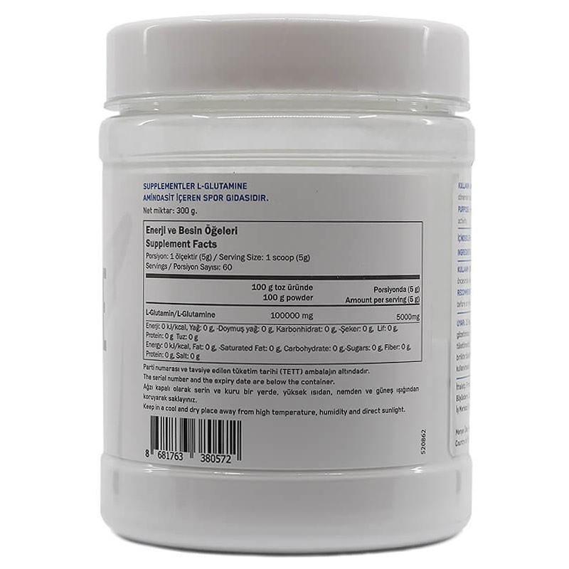 It is a high quality sports food that offers 100% pure glutamine amino acid. Supplements.com Glutamine, produced in the most modern facilities of Europe with GMP certificate, contains 5 g of high quality glutamine in each serving.Glutamine is the most abundant, semi-essential amino acid type in the human body. In individuals who do intense physical training, it is important to supplement as an amino acid supplement if the body cannot produce enough glutamine. Glutamine can be obtained from dietary protein, or it can be met with glutamine supplements.All Supplements.com Sports Nutrition are produced in Europe's most modern facilities, subject to strict inspection processes within the scope of GMP (Good Manufacturing Progress: Good Manufacturing Practices). Supplements.com is presented in a completely transparent bottle so that you can see the purity and quality of Glutamine in the clearest way.