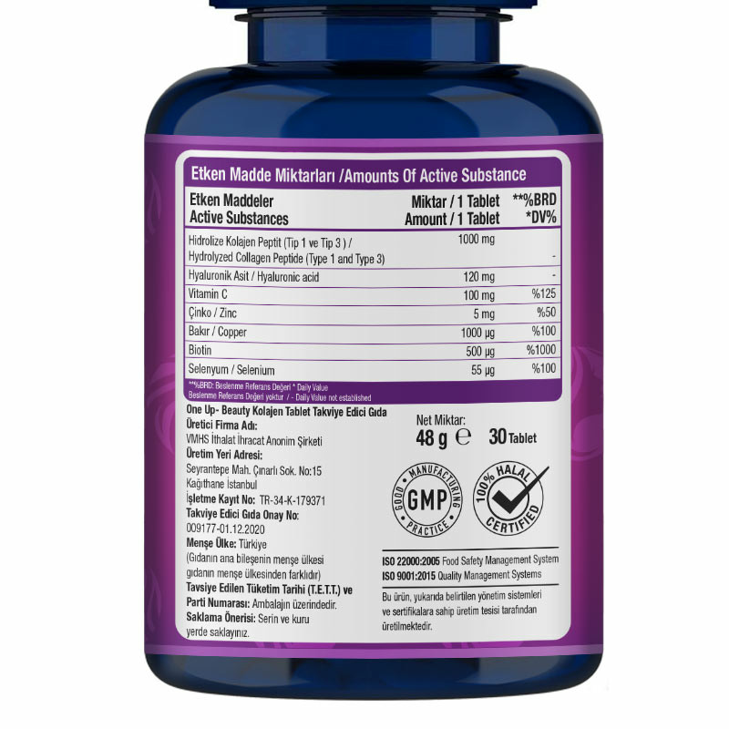 One Up Collagen Hyaluronic Acid, whose formula is created by supporting type 1 & 3 hydrolyzed collagen peptides with hyaluronic acid, is a food supplement that offers 1000 mg of collagen support in each serving. It has a complex formula containing 120 mg of hyaluronic acid support, as well as biotin, selenium, zinc, copper and vitamin C. Thanks to the 3000 dalton collagen molecular weight, the product is quickly absorbed by the body. One Up Collagen Hyaluronic Acid, which does not contain sweetener and gluten, is available in tablet form that provides easy consumption.Click for more detailed information about hyaluronic acid .