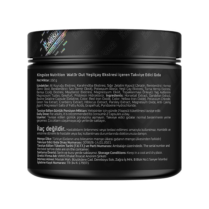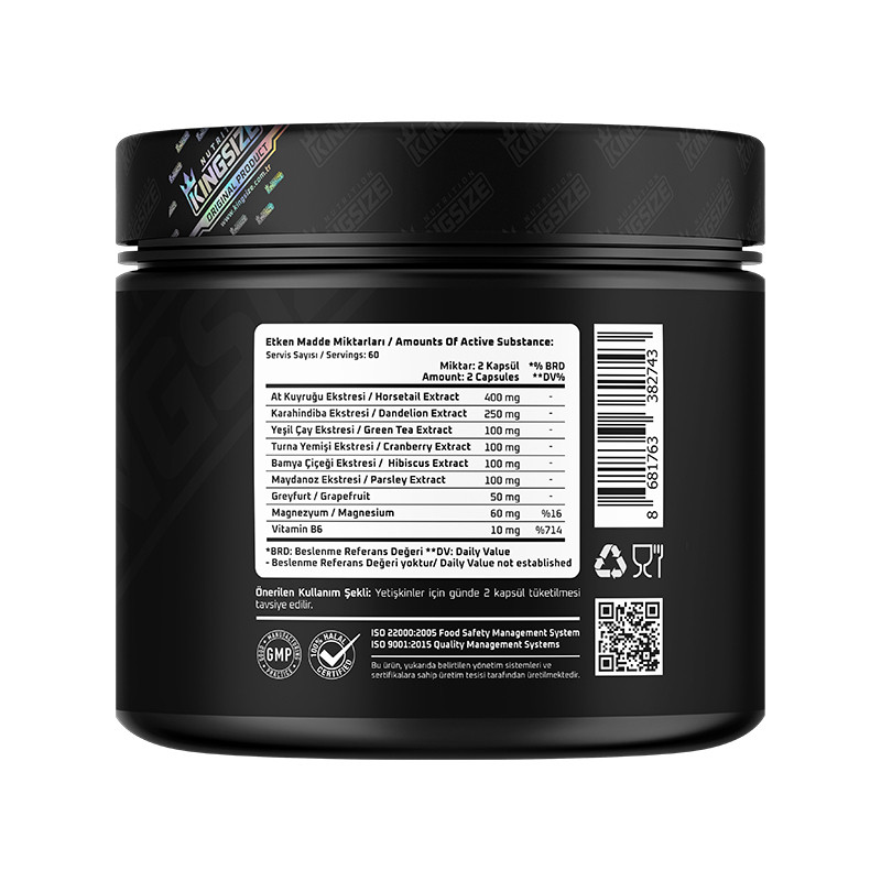 Thanks to its complex and herbal formula, Kingsize Water – Out, which helps the body of athletes to achieve a 'dry' appearance, contains high amounts of Dandelion (Dandelion), Horsetail (Moon Tail) and Cranberry (Cranberry) extracts. Other remarkable components of the product are Green Tea and Parsley extracts, which are frequently used by every athlete during the definition period.