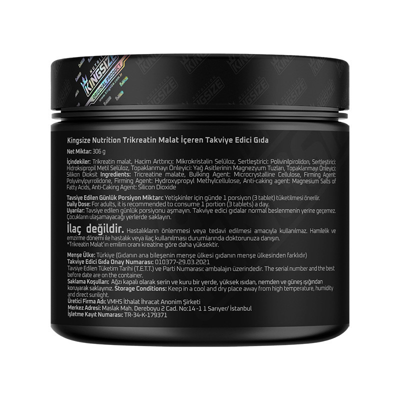 Kingsize Nutrition Tri-Creatine Malate is an athlete food designed to improve performance, give professional athletes more endurance and push the limits of exercise time.Offering 4000 mg of tri-creatine malate supplement per serving, Kingsize Nutrition Tri-Creatine Malate contains a proprietary blend of three creatine and one malic acid in a 3:1 ratio. The tri-creatine malate form, which enables creatine to be rapidly absorbed by the body, shows high bioavailability in the body. The product, which can be used for 60 servings, provides long-lasting performance support to athletes.