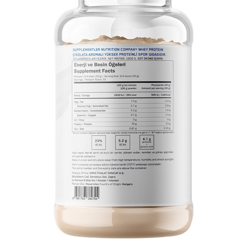 Supplements.com Whey Protein contains 77% premium quality whey protein. Produced in European standards, in modern facilities with GMP certificate, this product offers 23 g of protein per serving . With 5.2 g of BCAA and 4.1 g of glutamine precursors from whey protein in each serving, it will meet your amino acid needs in the purest and most cost-effective way. Protein contributes to the increase and maintenance of muscle mass. At the same time, protein helps maintain normal bones.100% of the protein it contains is 100% whey concentrate obtained by ultra filtration technology. The raw material used belongs to Volac, one of Europe's fastest growing and ambitious international dairy producers. With over 40 years of experience, Volac contributes to people's longer and healthier lives by producing milk and dairy products from sustainable and natural sources. It has an integrated facility only for the production of whey protein. Produced from whey, Volac Whey Protein can maintain its freshness and quality for a long time. It is presented in a completely transparent bottle so that you can see the superior raw material quality and purity of Supplements.com Whey Protein in its simplest form. It does not contain any additional amino acids, stimulants or synthetic active ingredients that can reduce the purity of the protein.