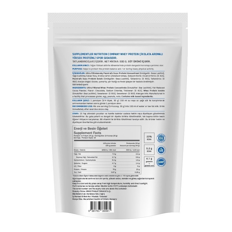 Supplements.com Whey Protein contains 77% premium quality whey protein. Produced in European standards, in modern facilities with GMP certificate, this product offers 23 g of protein per serving . With 5.2 g of BCAA and 4.1 g of glutamine precursors from whey protein in each serving, it will meet your amino acid needs in the purest and most cost-effective way. Protein contributes to the increase and maintenance of muscle mass. At the same time, protein helps maintain normal bones.100% of the protein it contains is 100% whey concentrate obtained by ultra filtration technology. The raw material used belongs to Volac, one of Europe's fastest growing and ambitious international dairy producers. With over 40 years of experience, Volac contributes to people's longer and healthier lives by producing milk and dairy products from sustainable and natural sources. It has an integrated facility only for the production of whey protein. Produced from whey, Volac Whey Protein can maintain its freshness and quality for a long time. It is presented in a completely transparent bottle so that you can see the superior raw material quality and purity of Supplements.com Whey Protein in its simplest form. It does not contain any additional amino acids, stimulants or synthetic active ingredients that can reduce the purity of the protein.